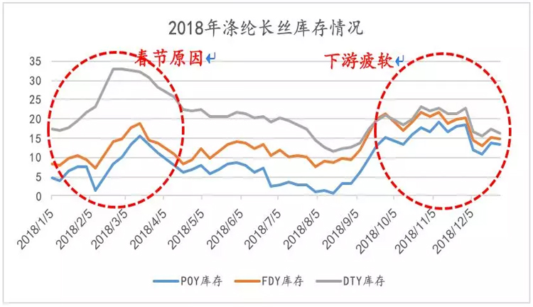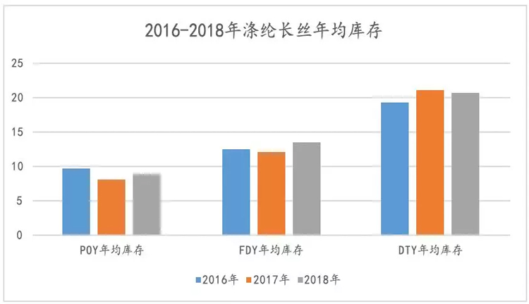 縱觀全年滌綸長絲年均庫存情況,2018年POY和FDY均較2017年有小幅提升,DTY庫存則小幅下滑(這主要出于行情劇烈波動、尤其在下跌行情下,加彈企業(yè)對庫存把控更加嚴格)。