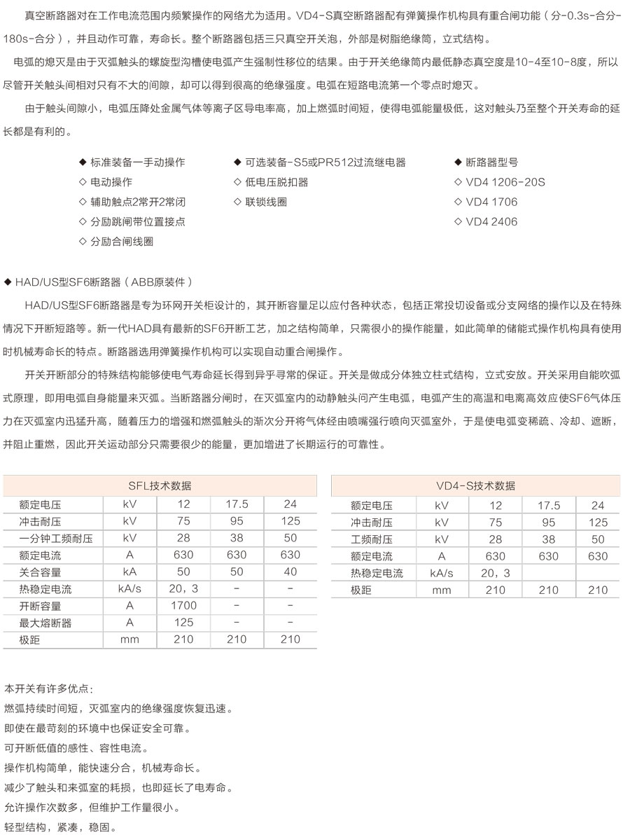 環(huán)網(wǎng)柜的主開(kāi)關(guān)、操作機(jī)構(gòu)及元器件采用ABB公司原裝件或采用進(jìn)口部件國(guó)內(nèi)組裝生產(chǎn)的SFL-12/24型開(kāi)關(guān)設(shè)備,也可根據(jù)用戶需要配裝ABB公司原裝HAD/US型SF6。斷路器或VD4-S型真空斷路器。其操作方式分為手動(dòng)、電動(dòng)兩種。